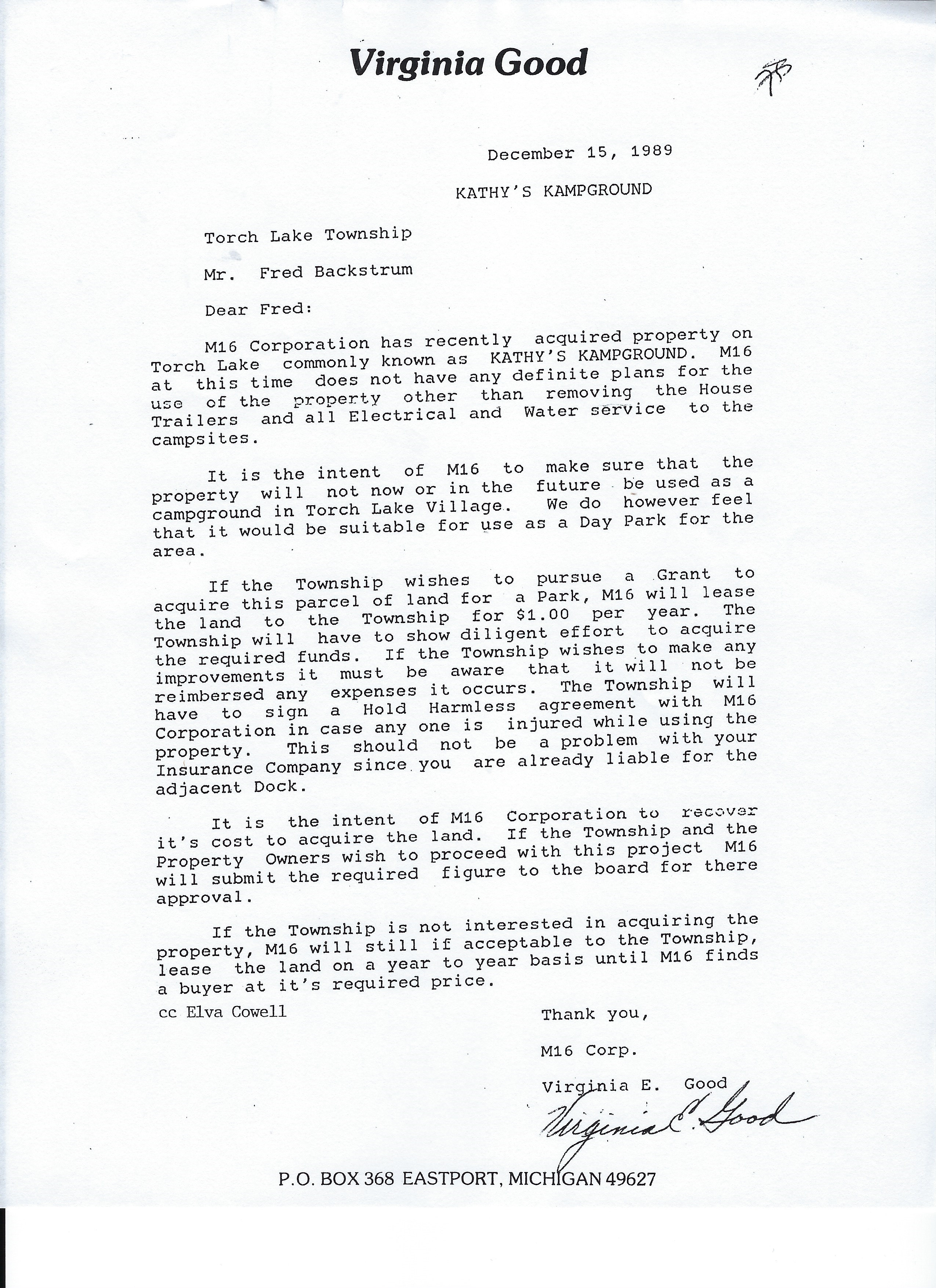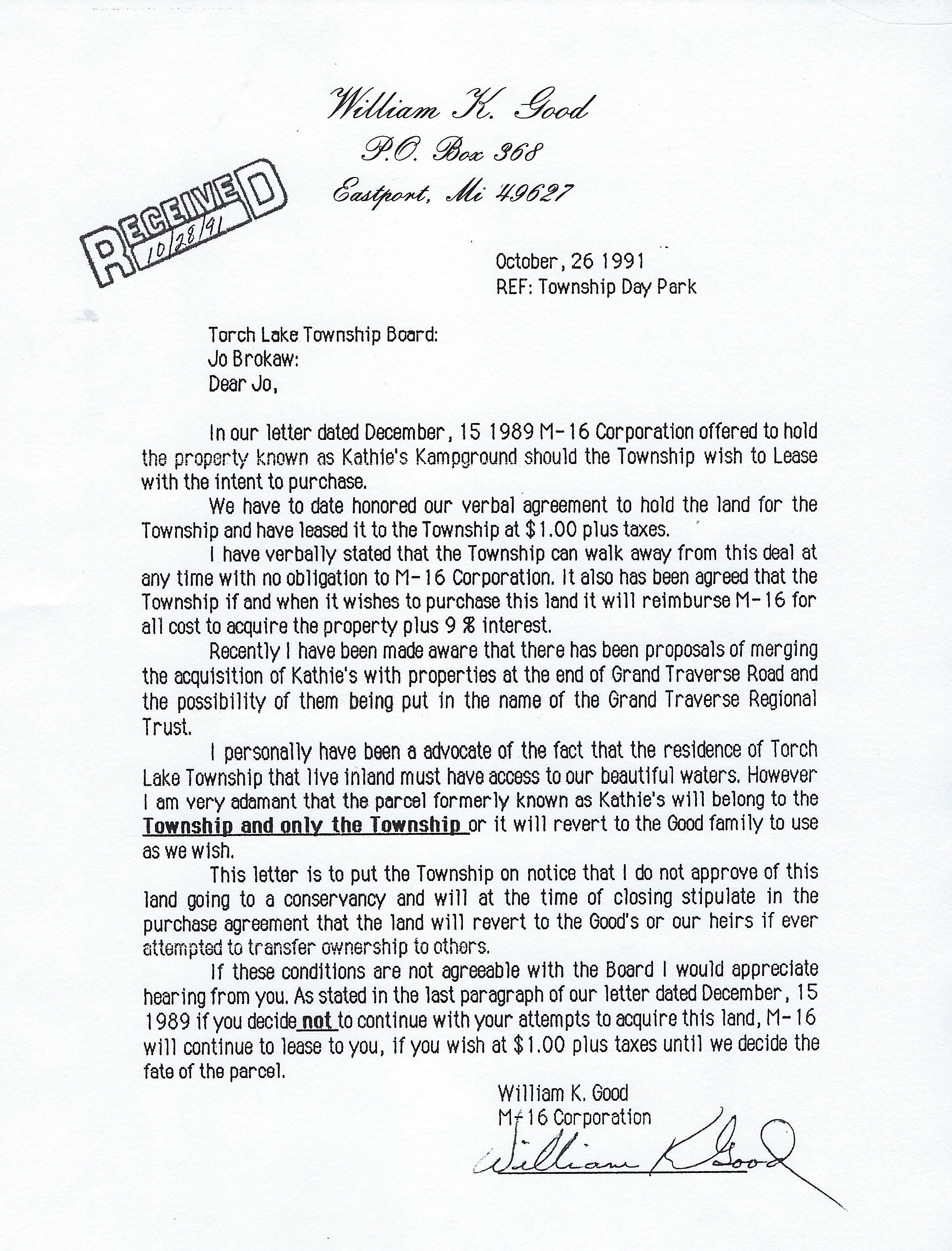 1. Aide Memoire (February 11, 1990) 2. Closing Statement (November 10, 1993) 3. Commitment for Title Insurance (September 1, 1993) 4. DNR Grant to Day Park (July 1, 1992) 5. Funding Source Memo (February 8, 1990) 6. Installment Purchase Contract (November 10, 1993) 7. Lease M16 to Township (March 1, 1993) 8. Memorandum (January 5, 1990) 9. Quit Claim Deed 10. Resolution Approving Day Park Purchase Contract (November 4, 1993) 11. Statement of Just Compensation (October 1993) 12. Virginia Good letter (December 15, 1989) 13. Warranty Deed 14. William Good letter (October 26, 1991)